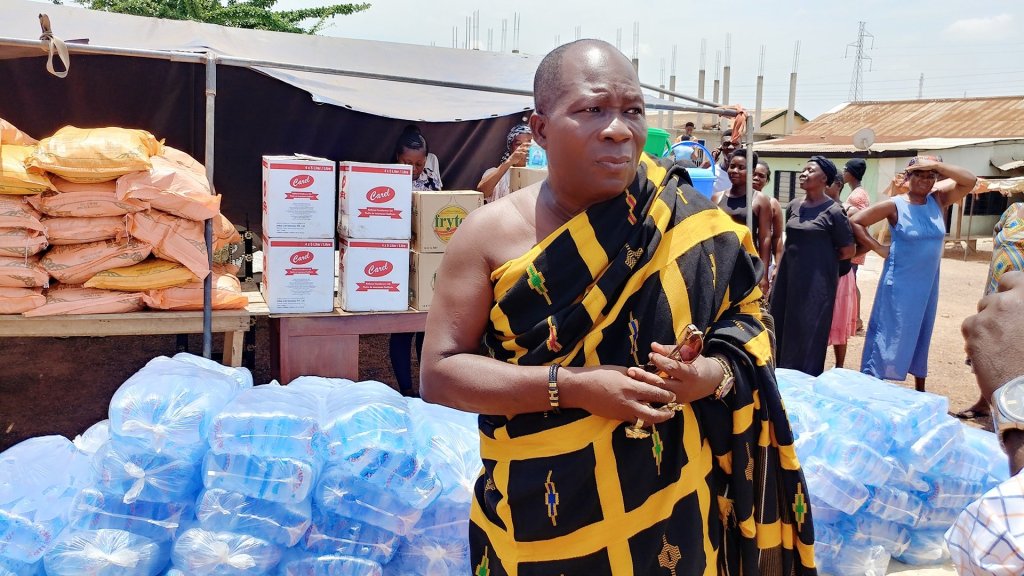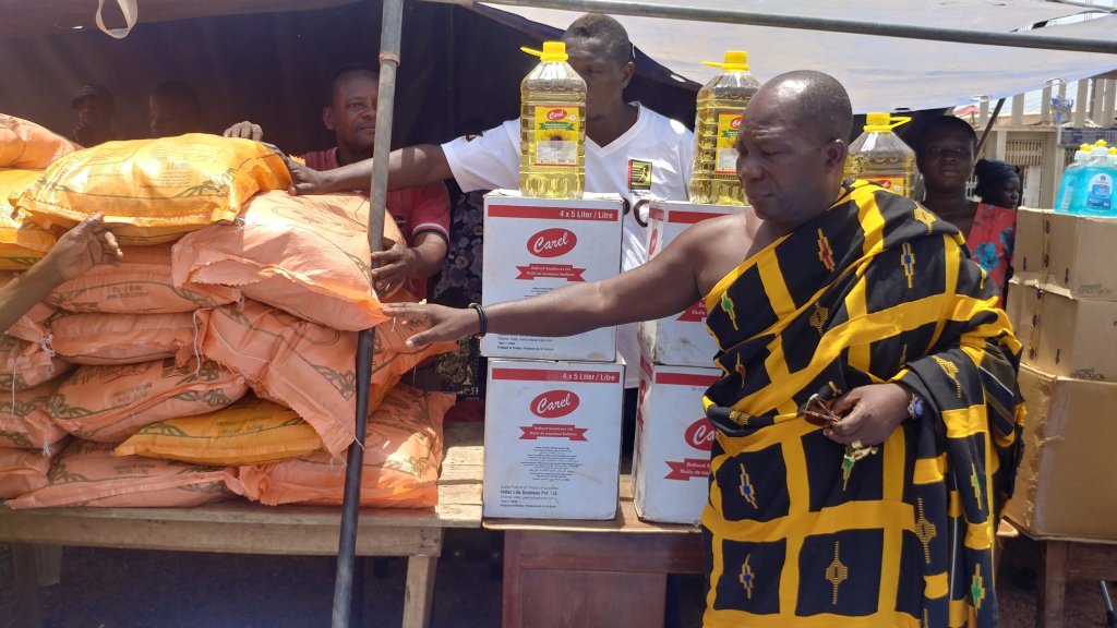 Following the coronavirus lockdown in the greater Kumasi by government over the spread of the virus,the Chief of Asokwa in the Asokwa Municipality Nana FE-BAAMOAH ll has today distributed food items to every household in his domain.