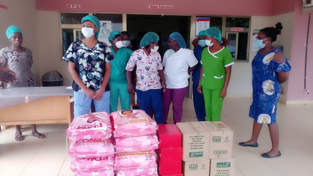 The frontline health beneficiaries at Aburaso Methodist Hospital and Nwamase Community Clinic each had a number of bags of rice, cooking oil and tins of sardines.